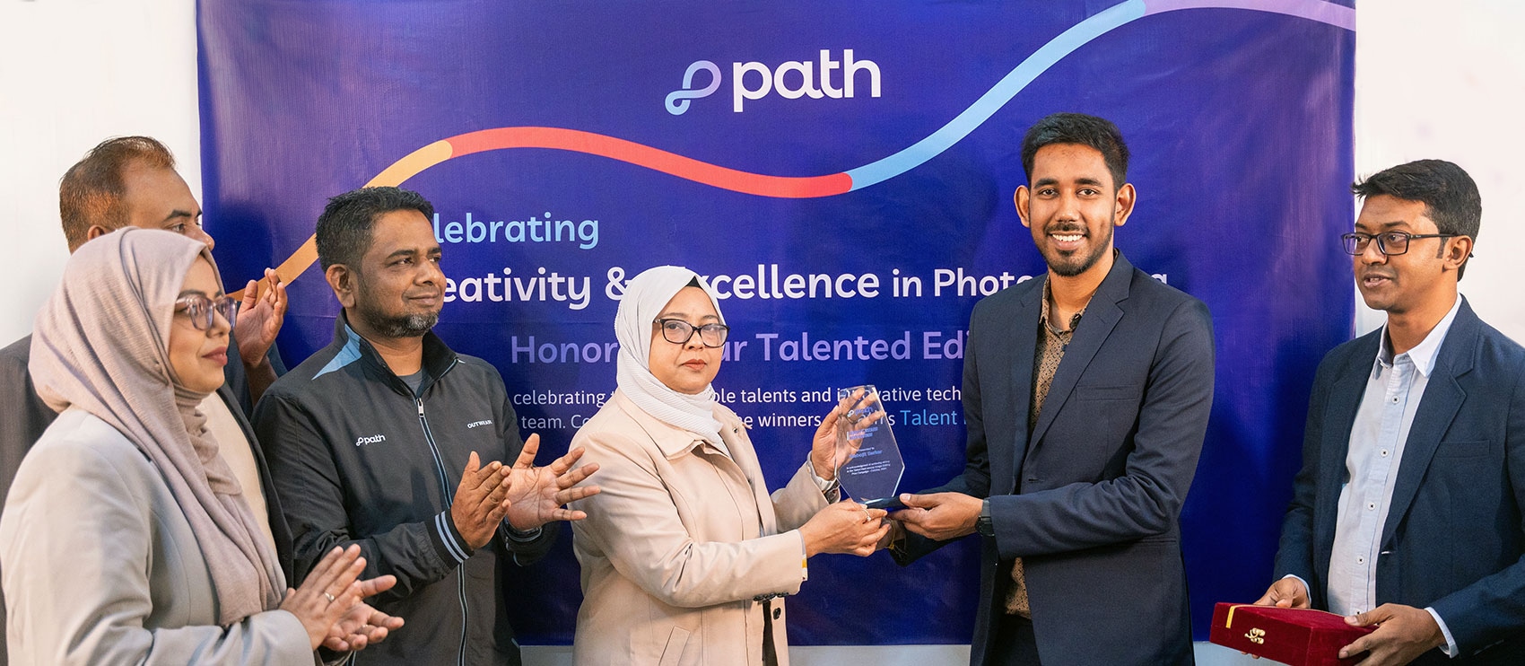 Man editing a product image of a grocery basket in Photoshop on an iMac, with colorful Path branding curves in the foreground.